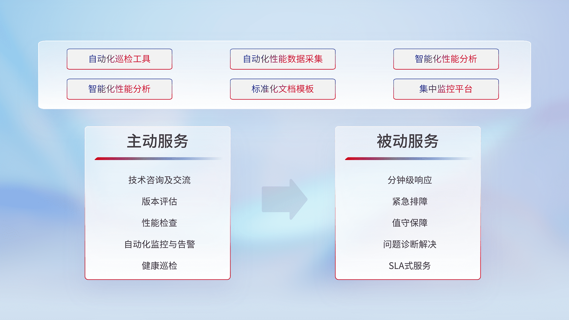 智能化工具和标准化文档,,保障服务质量,,提供主动服务(包含技术咨询、、、、版本评估、、、性能检查、、自动化监控与告警、、健康巡检)和被动服务包含(分钟级响应、、、紧急排障、、、值守保障、、、问题诊断解决、、、、SLA服务)。。