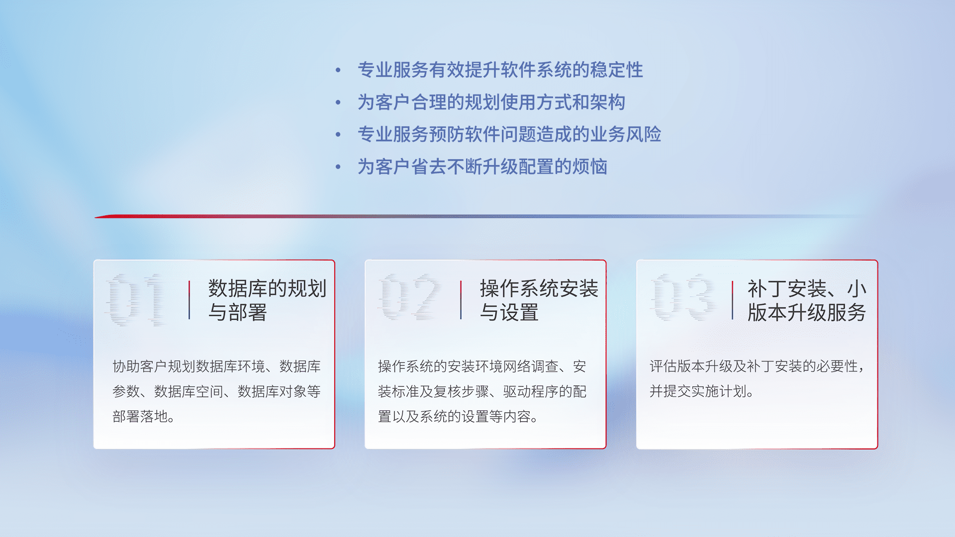 为客户提供软件规模升级、、、快速部署、、、、按需配置的专业服务,,从数据库的规划与部署到操作系统的安装与设置,,,,再到补丁安装和小版本升级提供支持。。
